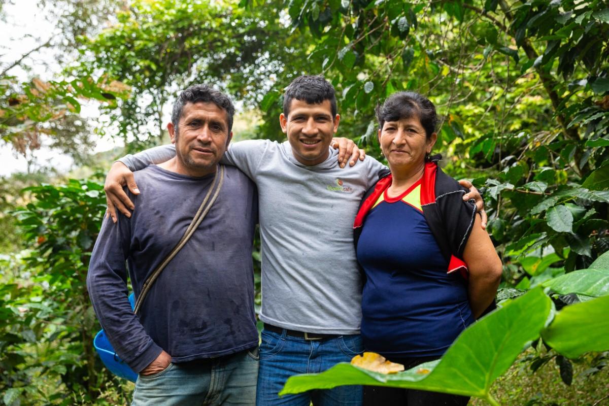 Mauro Pérez Bustamante and Grimaldina Guevara Calderón, a coffee producing couple and both members of a Fair Trade Certified coffee cooperative, pose with their son, Ivan Pérez Guevara, in the coffee field they own and manage.